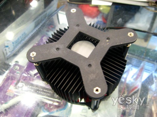 AVC最新研究成果十字形鳍片,据说可以更有效的吸收热量,让热量均匀的散发,提高了散热效率。鳍片使用铝挤工艺,增大了整个底座的热容量。散热底座的侧面也有鳍片,这种设计更大限度增大了鳍片的散热面积,提高散热器的效能。