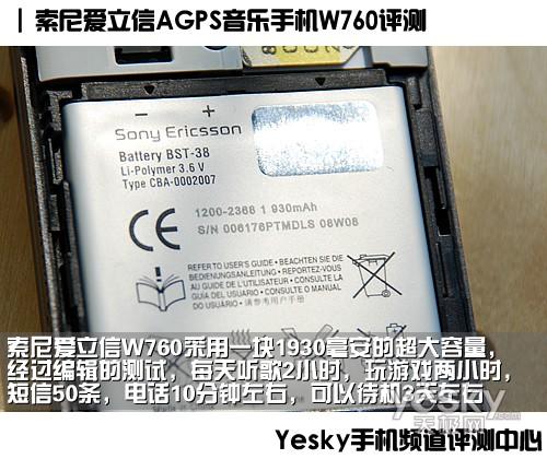 索尼爱立信W760采用一块1930毫安的超大容量,经过编辑的测试,每天听歌2小时,玩游戏两小时,短信50条,电话10分钟左右,可以待机3天左右,这样的玩机强度。