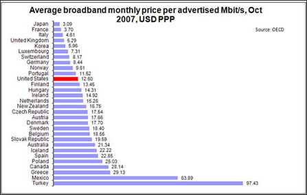芬兰31.2美元每月,德国32.2美元,瑞士32.7美元,英国33.3美元,丹麦33.6美元,这几个国家排名最前。接着美国排在21位,平均每月53.1美元费用。这里我们特别关注一下日本,在之前的数据中显示,日本的速度最快,虽然价格排瑞典的后面34.21美元每月,但是将这个价格除以速度,也就是每Mb宽带的价格的话,却是最便宜,最实惠。看看国内情况,4M宽带服务价格为120每月(据称这价格相对其他地区来说算便宜的了。)换算成美元约为18美元,最大下载速度是400k/s,约为0.4Mb/s。那么18美元除以0.4M/s就等于45美元每Mb/s了。把这个价格放到下表中对比,一看便知是否实惠。也许相对土耳其来说,我们是值得庆幸。但是比起日本等国,我们就真的需要考虑,我们花的钱到底值不值了。