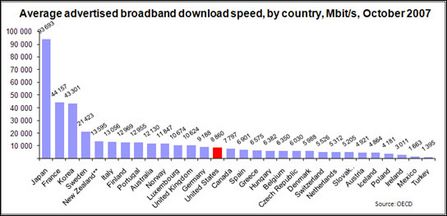 世界经济合作与发展组织OECD去年发布的宽带平均广告速度数据显示,日本的宽带速度更是惊人!达到了93.69 3Mbit/S。接着是法国达到了44Mbit/s左右,韩国43Mbit/s。