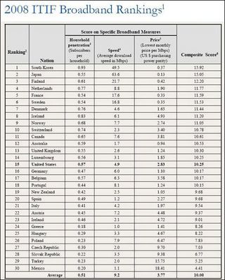 上个月,国际信息技术与创新基金会(ITIF)发布了一份2008年全球宽带网络建设状况排名,该排名从宽带的普及率、平均速率以及价格等多方面来对各个国家的情况进行统计。
