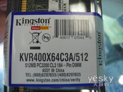 金士顿512MB DDR-400内存外包装采用我们所熟悉的普通包装盒,透过透明的塑料外壳我们可以看到里边的内存条。在买内存之前一定要看下封条是否拆开。以免经销商偷梁换柱。通过贴封可以看到内存容量,产地为中国。