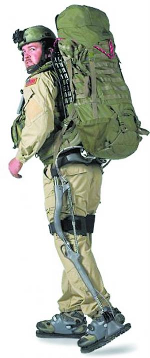 美国伯克利机器人与人类工程学实验室的卡兹罗尼博士设计的HULC下肢外骨骼,主要用于为健康人行走助一臂之力。这套装置包括一对腿部助力结构和一个背架,背架中配有一只1加仑油箱和一台汽油机,利用液压为各运动部件提供能量,也为传感器和计算机提供能源。