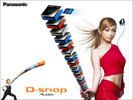 松下自从进入MP3领域以后,同其他日系厂家一样,开发的多是外观音质俱全的随身听产品,并更把随身听更当作一种时尚饰物,而流行女王滨崎步不仅仅具有甜美的歌声,其对时尚的把握也具有很大的导向作用,她吃的东西,歌迷会去吃,她的头型歌迷会去模仿,所以厂家自然希望歌迷也同她使用一个牌子的MP3随身听喽。