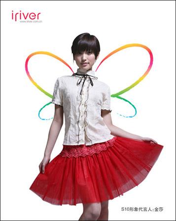 作为海蝶音乐2005推出的年度最佳新人,金莎的清纯可爱可以说是其广受喜爱的不二法门。素有“海蝶音乐小公主”之称的金莎,从尚未涉足歌坛就开始为众多国际知名品牌担任形象代言。自2005年推出首张个人大碟《空气》之后,金莎更是在乐坛掀起了一股清新狂潮。在华语乐坛名声大噪的同时,金莎也凭借其甜美靓丽的外形、清新可人的气质被更多的商家“相中”,先后为诺基亚手机、周大福珠宝等国际知名品牌担任代言。与此同时,金莎还以其独特的亚裔偶像气质在全亚洲范围内受到广泛关注,代言足迹遍布新加坡、马来西亚、韩国等国,成为了内地歌手中,名副其实的代言小天后。此次,为iriver S10担任代言,也正符合了金莎甜美可爱,清新时尚的个人气质,这款全新的数码产品,未上市已成为不少歌迷争相抢购的焦点。