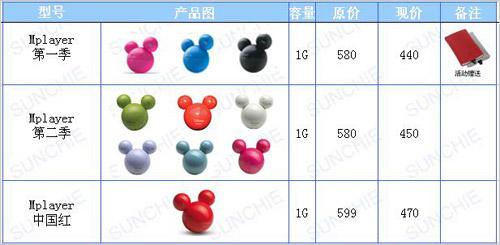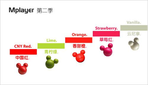 iriver米奇MP3(Mplayer)相信大家都已经很熟悉了,提供了十余种颜色供选择,包括最先推出的黑色、白色、银色、蓝色和粉红色五种颜色;第二季的青柠绿(Lime)、香甜橙(Orange)、草莓红(Strawberry)和云尼拿(Vanilla)四种颜色;以及为中国为中国传统节日——春节而特地推出的红色版,是一款以色取胜的代表作。