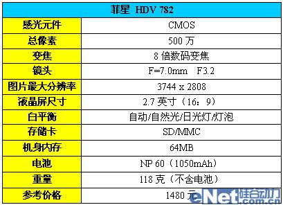 虽然名气比不上日系大厂,但菲星还是提供了完整的配套设施,说明书、软件光盘、耳机、连接线缆等一应俱全,用户只需购置一张SD存储卡就可以开始拍摄了。我们先来看一下菲星HDV 782的主要参数指标: