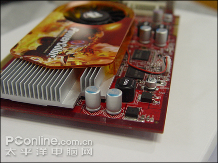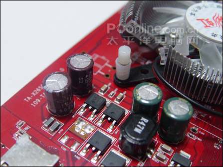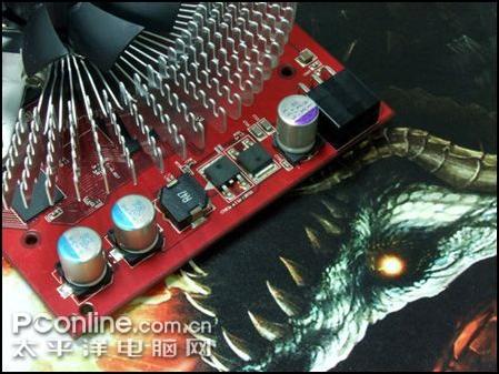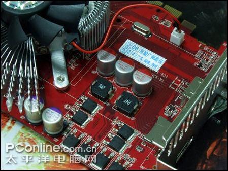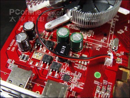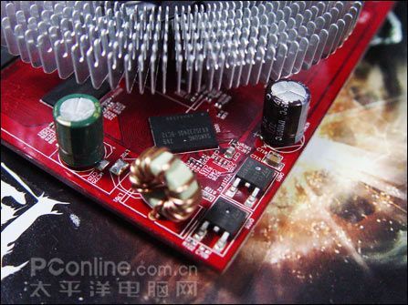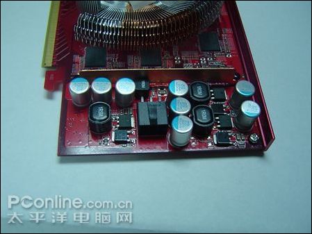 供电部分设计比较精良,由于采用55纳米的工艺,RV635本身功耗并不大,所以用高品质电容,全封闭式的电感,以及高质MOS管组成的供电部分可以充分保证其稳定的运行。