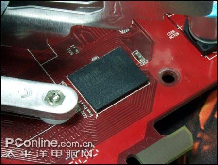 为了保证让热量快速传递到空气中达到最大的散热效果,散热鳞片被打造得很薄,因此在出厂是加上了一个保护盖,以免运输途中或安装显卡时被折弯,掀开保护盖可以看到密密麻麻的铝制鳞片。显卡的正反两面分别搭载了两颗三星 2.5ns GDDR2 的显存颗粒,组成 256M 的显存规格,频率为 800MHz 。