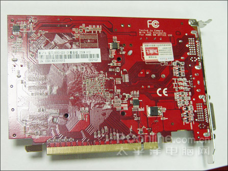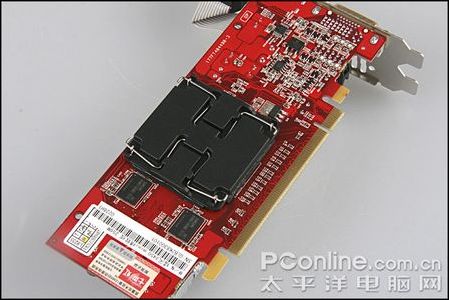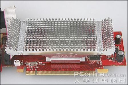 显卡采用的是“刀版”的设计,因为 HTPC 的机箱都比较小,小板卡的设计有利于节省机箱空间,便于散热。该显卡的散热器采用了被动式散热,因为主动式散热器的噪声会影响客厅的音响效果,而且采用 55nm 的 Radeon HD 3450 发热和耗功都很低,被动式散热已经足够了。虽然是 mini 版,但供电模块方面没有偷工减料,滤波电容用的是日系的优质电解电容。