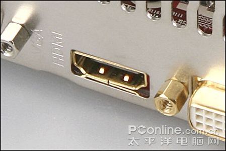 作为 Full HD 显卡,当然要有 HDMI 接口, 该显卡的 HDMI 和 DVI 都用了镀金接口,有效的减少信号在接口处的阻抗降低失真。由于 HDMI 规范要求视频流和音频流在同一接口输出,所以镭风 3450 mini 版内部同时也集成了 Dolby 认证的数字声卡,支持多声道的输出。