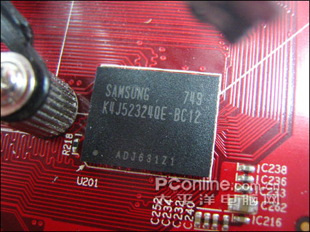 板载三星 1ns GDDR3 显存,该颗粒新品出场,相信性能方面较以往产品出色,单颗规格 256M/32bit ,共 4 颗组成 256M/128bit 显存规格,双 BOIS 提供两种核心 / 显存频率,分别公版为 725/1600MHz 及超频 800/2000MHz ,频率的改变只需轻轻拨动一下背板开关,值得注意的一点是,不可带电操作,有可能导致元件烧毁,切记切记。