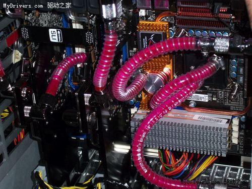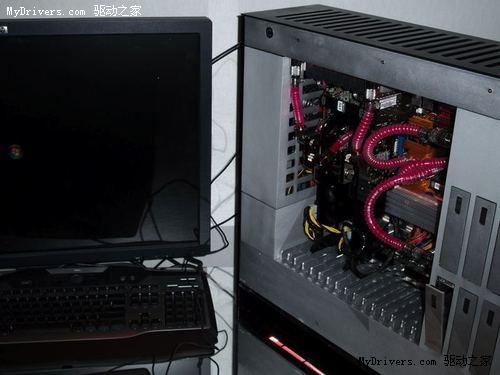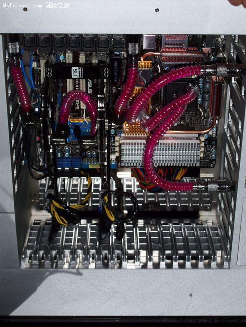打开机箱我们就可以看到,尽管外形巨大,但机箱内部的空间其实并不多,四周很多的空间都被宽宽的机箱边缘占据。这其中自然是别有洞天,该机的CPU、显卡、主板芯片组都采用了液冷散热,而液冷导管也使用了昂贵的纯铜材质,液冷泵、散热器和大量的导管都隐藏在这些边框中,保证了机箱内部的整洁。