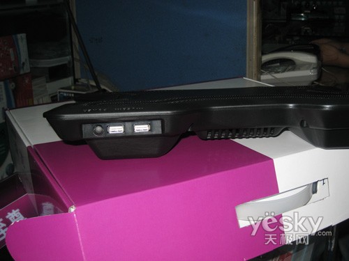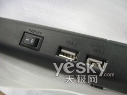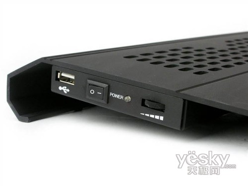这款散热器的动力是通过USB供电的,底座后面就提供了2个USB接口和散热器开关。