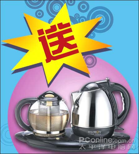 易美逊显示器向来是在市场中的一匹黑马,总是在市场中最关键的时刻,出台一些令人非常兴奋的“政策”。其中主要归功于他作为全球第一大显示器生产商冠捷科技(TPV)旗下的自有品牌。正是拥有了最强大的实力后盾,所以ENVISION易美逊一直拥有其它品牌无法比拟的产品和性价比优势。像在24寸宽屏方面,易美逊就一直把持着最低价的纪录,今日再下狠手,2499元再送338元电热水壶套装。