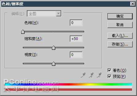 2、通过【图像_调整_色相饱和度】〖CTRL_U〗将灰度图像着色为红色,设定如下图17。效果如下图18。