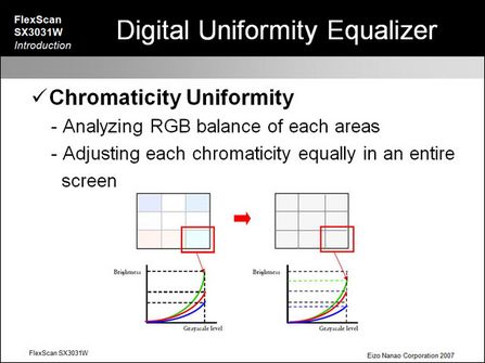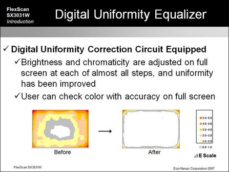 一般而言,较大的显示屏会出现边缘色彩偏差问题,而 EIZO 为解决此问题,遂将 Digital Uniformity Equalizer (DUE) 技术加入 FlexScan SX3031W 之中。DUE 其实是 EIZO 于超过 27 英寸显示屏内加入的专利技术,原理是透过内置的 Eizo Original ASIC CC-1 集成电路,将画面作分区独立控制,使用后能将偏差值由 3.5 - 7.4 压抑至 1.0 - 3.5 ,令全画面色彩显示一致。