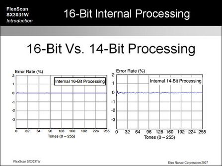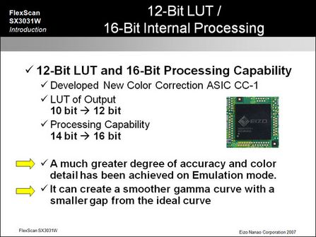一般显示屏只支援 8 bit 灰阶,即 16.7 万色彩显示,而 Eizo Original ASIC CC-1 集成电路支援 16 bit 影像运算,能处理 12 bit 灰阶,好处是能从 6800 万色彩调色皮中选取最适用的 16.7 万色使用,灰阶渐变显示更顺滑,图像深色部更细致。