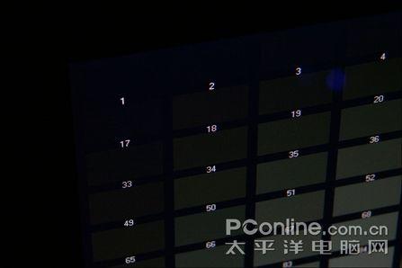 DisplayX的灰阶测试中一共有256个方格,就是从白到黑的逐步变化。白色是所有显示器都能够实现的,因此主要是看左上方的黑色方块。主流的液晶显示器能够看到第三十五号方块,比较好的就能看清18号方块,而只有极少数相当优秀的显示器能够把所有方块看清。至于在看的时候也要有点技巧,一般来说以自下向上通过显示器可视角度的变化能够较好地进行分析。