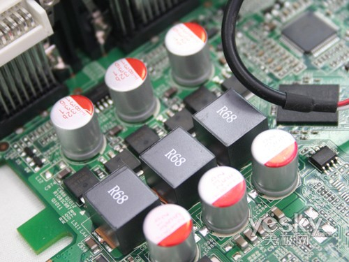 显卡供电模块使用3+1相加强供电设计(核心三相、显存一相),相比公版设计更加奢华。供电部分采用更加合理的显存与核心供电分离设计,有效降低电磁干扰。供电部分使用日系富士通固态电容搭配R68全封闭铁素体电感,每相使用两个高品质MOS管稳压,为显卡提供了稳定的电流输出,保证了显卡的稳定运行并提升了显卡的超频能力。