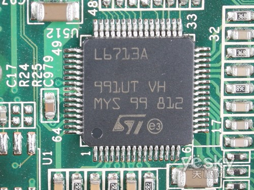 显卡采用国际著名的IC制造公司ST意法半导体出品的L6713A PWM控制芯片,可提供两相和三相电路控制功能,它可以同时控制多路12V输入,并负载100+安培的电流,并能够视核心负载情况进行供电,达成节能省电目的。[/