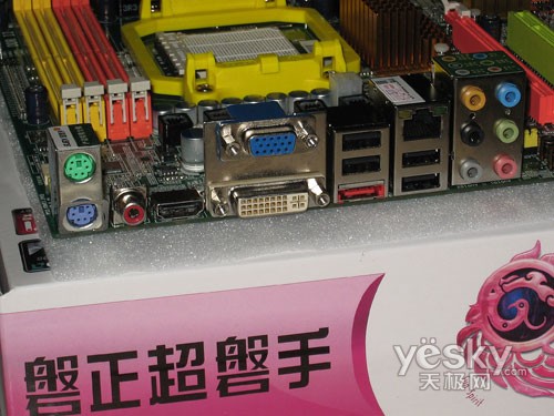 磐正超磐手AK780G主板的I/O接口非常全面,提供了DVI+VGA+HDMI接口组合,还有同轴接口,e-SATA接口,4个USB2.0接口以及千兆网卡接口、8声道声卡接口。