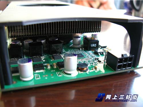 我们可以看到,耕昇 9600GT红旗H版供电部分设计非常扎实,其规格远远高于这个价位的显卡应有的设计。首先在电容上,全部采用日本三洋重工出品的高档固态电容,而且数量众多,弥补了固态电容储电量较小的劣势。采用豪华的四项供电,其中三项是GPU核心供电模块,这样才保证了被超到如此“H”的频率的GPU核心还能稳定工作。而且电感采用了货真价实的全封闭式电感,隔绝了电路间互相干扰的可能。为了保持供电的稳定,需要独立的6pin电源口独立供电。