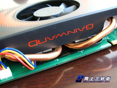这款产品在散热器上非常用料就非常实惠,采用双热管散热器加强散热。我们可以看到,散热器的铝质鳍片非常密致,两根直径4mm的U型热管两次由上而下贯穿散热片,将热源与储热鳍片相连接,起到相当于四热管散热器的效果。与GPU热源相接触的底座采用纯铜镜面抛光工艺制作,具有很好的导热效果。在散热部分已经如此上心,那么作为显卡主体的PCB相信也会有很扎实的设计。而且这款耕昇显卡的散热器保持了耕昇一贯注重静音的特点,采用了4pin接口的可调速风扇,在非满负荷状态下可以减小转数和噪音。