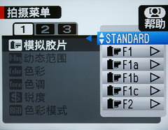 S5PRO 的菜单与富士消费级数码相机的菜单非常相似,白色的底蓝色的高亮显示,在拍摄选项中模拟胶片模式已经扩展到了多达5种的模拟胶片效果,在使用“富士反转片”模式时,图像就会变得等饱和色彩更接近传统的富士反转胶片的效果。而新的3种胶片模式能使用于更多的拍摄环境。