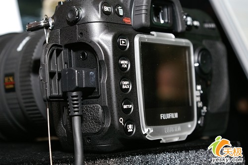 S5Pro机身的另一侧面提供有USB2.0、AV输出以及线控接口。S5 Pro没有提供S3 Pro机身上的IEEE 1394接口。但这款产品能通过一个通过连接一个特殊的条形码识别器RS-232C为图像增加注释内容。同时它还提供有多达3重的密码保护系统。