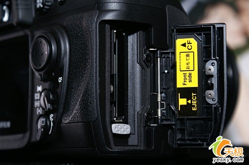 我们再来看看S5 Pro的机身侧面,这款产品的机身侧面提供有存储卡槽,我们知道近几年所发布的富士数码相机均配备有xD卡槽,S5Pro的前代产品S3Pro也不列外,而此次,我们发现S5 Pro仅提供有CF I/II型卡槽,当然其还能使用MD微型硬盘。我们认为这样的设计并没有太大的不妥,毕竟相对于CF卡而言,xD卡在价格和容量方面的劣势非常明显。