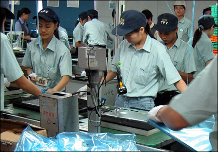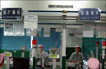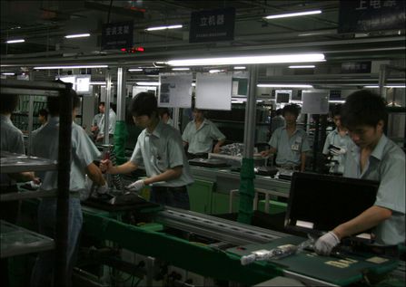 在福清冠捷工厂内,06年开始在原厂区北面新拔地而起的一座5层高的新生产厂房。这就是冠捷与中华映管合作创立的华冠光电的生产线所在,在冠捷被成为北厂。工作人员介绍,在这里所生产的产品为为液晶显示模组(LCM),由将组立框架﹑背光板﹑驱动IC与CELL组装而成,并直接提供冠捷在福建和武汉的工厂用于组装显示器和TV。北厂跟其他车间的最大不同在于是从五层的面板切割到一层的LCD成品组装,完成的是真正的一条龙生产。也就是从LCM组装到LCD显示器成品出货,在一栋楼里全部完成。