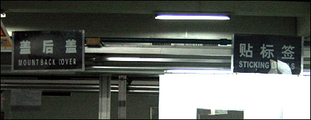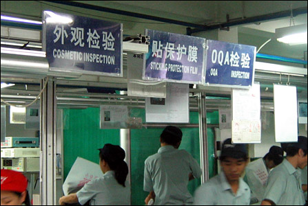 过程有外观检验、贴保护膜、OQA检验等。所有的分工程序都严格细化,盖后盖、贴标签都由专门的工序去完成。
