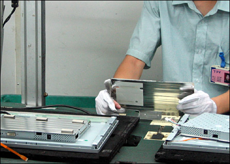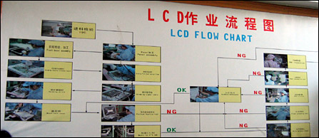 LCD制造流程可分为进料检验;Panel加工;前框检验、加工;升压器与主机锁付;锁付信号线;保护罩锁付;盖后壳;预热前功能测试。中途还有多个检测NG环节,据冠捷有关人士介绍,目前一台LCD显示器的生产工时为0.5个工时,若在新的生产流程下,生产工时有可能更低。