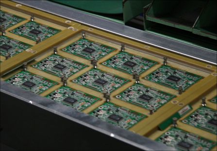 每条流水线上,都并排放置了几台机器,它们负责把那些经过抽检的小型元器件插到PCB板上。