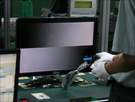 通过模拟日常工作中的磕碰情况,检测显示器的稳定性,如果图像没有不稳定的现象就可以通过测试,贴标签进行装箱,反之需要返工。到这里,一台显示器终于制作完成了,不过它现在还不能出厂,因为它还要接受最后的成品检验这一关呢,在高温高湿度的环境下,显示器要接受一次整机考验,一般会抽出一部分产品进行测试。当包装完成以后,产品还要进行破坏性实验,其中包括模拟振动、模拟落地等残酷的考验。只有经过所有测试项目的显示器才能在市场上销售。