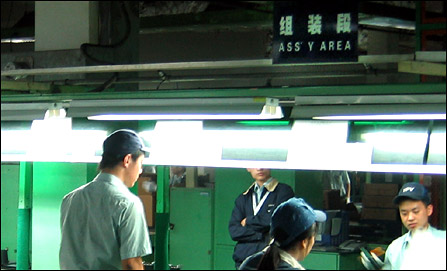 这个车间工作的工人,必须穿着特定的服装,这些服装上带有金属线,可以有效地抑制静电的产生,他们还带有防静作用的静电环,工作台上有一根通往大地的地线,静电环就与之相连。这条线上每位工人负责PCB上一部分插接式元件的安装。