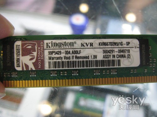 矮版金士顿1G/667台式机内存条上的贴标和普通内存没有任何区别,我们可以看到其内存颗粒上的标签产品型号为KVR667D2N5/1G,电压1.8V,产地为中国。