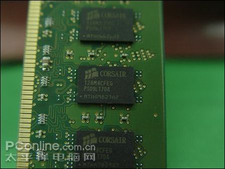 海盗船VS2G800D2容量为2GB,频率为DDR2 800MHz。属于海盗船的VALUE SELECT系列,虽然名气没有高端的CM2X高,但能把价格做到如此低的品牌内存确实不多。该内存采用了mBGA封装的内存颗粒,做工非常不错,焊点没有丝毫毛刺,密密麻麻的排阻能有效降低EMI(Electro Magnetic Interference,电磁干扰)。