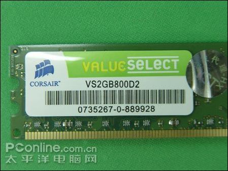 海盗船VS2G800D2内存颗粒由于采用了二次封装,看不出颗粒品牌。由于内存容量比较大的原因,海盗船VS2G800D2采用了双面设计。