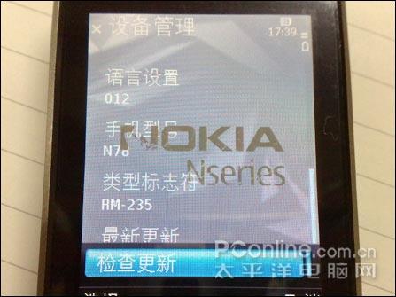 系统里功能看的差不多了,感觉没啥大问题,笔者习惯性的输入了 *#0000#(查询软件版本口令),没想到新系统又给我们带来了一些不一样的地方。首先不再是简单的几行,而且非常详细的列举出手机型号,软件版本、软件版本日期(并非手机出厂日期哦,以前很多朋友感觉软件版本好下面的日期是手机出厂日期,现在明白了吧?它只是软件版本的发布日期,不要被JS忽悠了)语言设置、类型标识符等等专业的信息都一一列举的很详细,而且还有个最新更新的选项,并且可以在线检查N78是否有最新软件版本可以更新,真是相当贴心的设计,给那些喜欢没事儿刷机的朋友提供了很好的途径,新系统果然更新了不少服务。