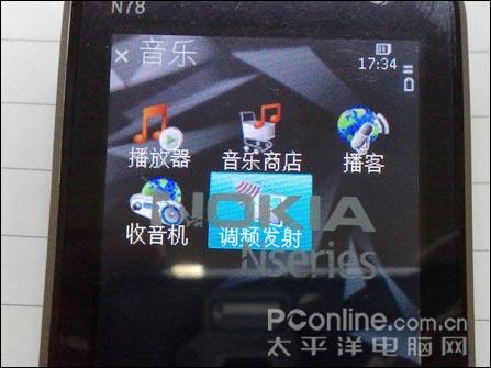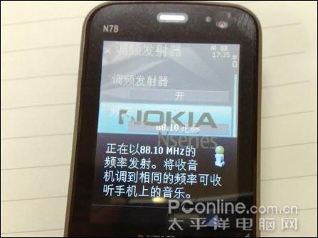 比如在“音乐”目录中,除了我们常见的播放器、收音机、音乐商店等功能以外,“频率发射”,也就是FM发射器这个功能,是亚太版、欧版的N78独有的,而港行和今后的大陆行货都没有这个功能,可能是怕个人设置的频率影响周边,所以取消了,不过说实话,这个功能能用到的几率很小,比较见仁见智的功能。