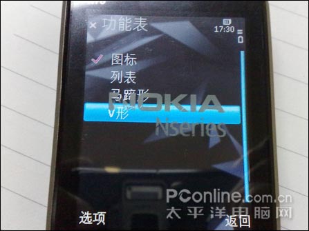 其次是五维导航键,支持Navi滚轮,其实在使用十二宫格列表的时候,用Navi滚轮功能并不是很实用,只有在使用V形、马蹄形的功能列表时候才会觉得Navi滚轮功能比较好用,所以如果习惯用十二宫格功能列表的朋友,还是去设置里将Navi功能关闭吧,这样会在使用方面稍微快一些,仅个人看法。