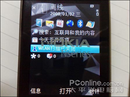 首先在待机画面中,大家就可以发觉,N78与之前的一些智能机有明显的一些区别,在显示电量标记的上方多了内存卡的图标,WLAN搜索的下方那个多了2个图标,左右功能的中间又多了一个选择,这些都是新系统的改进,其实快捷栏的排列,除了我们往常见到的这种横列方式,OS9.3还可以设置成数列的方式,当然这个都是花哨,不足挂齿。