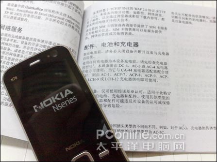 首先原装水货N78的配件包括,一块BL-6F(容量1200毫安)的电池,一个原装充电器(AC-3、AC-4、AC-5可以任意选择,根据自己的需要去换,毕竟很多人觉得3个插脚麻烦,都喜欢2个插脚的),一副线控耳机套装(AD-54线控转接头与HS-45耳塞),一根原装MicroUSB口数据线(型号CA-101),一张2GBTF卡(NOKIA原厂代工),说明书。除了说明书和包装盒子,其他都缺一不可,各位买家切记切记。
