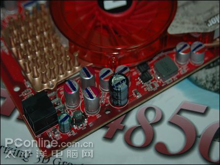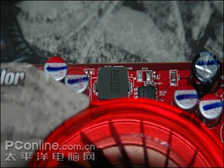 显卡采用了五项供电设计,其中四项供电为核心供电,一项供电为显存供电。供电部分采用了固态电容与点解电容相结合的配置,但是我们并没有在显卡上发现钽电容的身影。而电容上的笔迹则说明电容是经过工厂筛选出来的优等品,可以提供更好的电气性能。