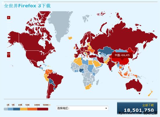 初步统计显示,Firefox 3.0发布后8小时下载量就已经有300万次,24小时内达800多万次,2天后升至1200万次,6天后的现在高达1850万次,确切数字是18501750。就国家和地区而言,目前美国贡献了5198311次,中国大陆贡献了434475次,朝鲜和几内亚比绍依然为零。