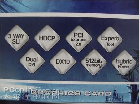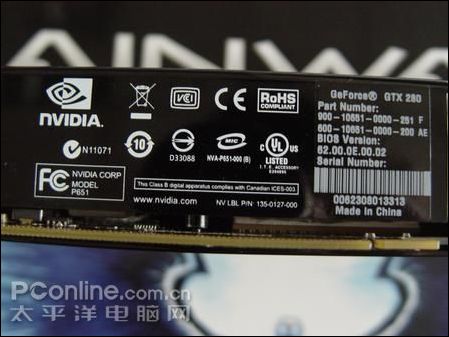 众所周知,GeForce GTX 280虽然首发厂商众多,但是其来源其实只有一个,那就是所谓的原厂公版,依照以往的经验应当是由鸿海代工而来,从到货的耕昇 GTX 280的底部铭牌来看确实如此。而之前在GeForce GTX 280首发之初,耕昇 GTX 280采用的全新的蓝色系包装就相当引人注目,虽然根据以往的经验首发的是国际版,但是随后曝光的耕昇A卡红色包装则彻底宣告了耕昇进入双卡时代,同时蓝、红两色也极有可能成为未来耕昇显卡N、A的主色调。
