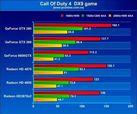 相信COD4的测试是比较令人兴奋的,Radeon HD 4800系列一改之前HD 3000系列的N卡一面倒状态。HD 4870/4850在AA和非AA状态在均战胜了对手GTX 260和9800GTX。