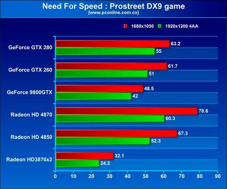 极品飞车11中,Radeon HD 4870的表现十分出色无论开AA与否均超过了对手的旗舰GTX 280,比起自家的HD 3870X2更是超过了100%的性能提升。